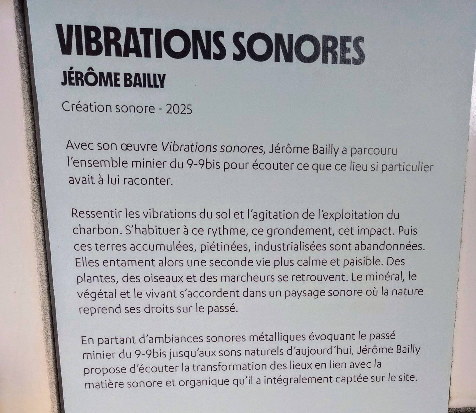 Jusqu’au 7 décembre 2025, découvrez ma création sonore « Vibrations Sonores » dans l’exposition « Révéler l’impact » dans la salle des douches de l’ancien site minier 9-9bis de Oignies, près de Lens.